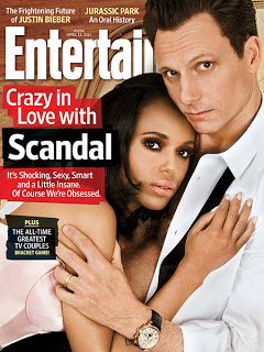 Edited to add: Entertainment Weekly finally put the Scandal hot couple on its cover. But highly computer tweaked, in my opinion, to reduce skin color variation between the two. I am still not convinced we have entered the colorblind era. On the other hand, at least they’re together, embracing, and on the cover of a major national magazine.