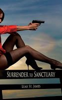 But I admit I couldn’t resist picking up the sexy cover to Surrender to Sanctuary, which clearly is a tale of another gun-toting strong female. Her spike heels and black hose also give an indication that this romance is likely to be hotter than some, as the sales copy also states.