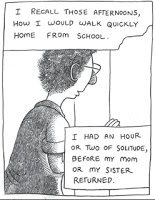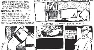 Each story is short. Some describe childhood moments of hilariously incorrect sex education (no, babies do not usually come from the “spurmm bank”). Some recount first sexual experiences, whether kissing, or cross dressing, or having sex while drunk. Some talk of relationships in which the sex was or became abusive, and the narrator finally realized it. A few stories simply are tales of sexual encounters, whether pornographic or disastrous. The reminiscence about blacking out at a party, waking up while being date-raped, and then throwing up had emotional heft, but its storytelling method did not appeal to me as a comic book art. It’s mostly words in panels, and barely any illustration. I prefer the very literal. Then again, I’m not sure I’d want to see that particular story drawn in real life detail. More accurately, true to my romantic inclinations, I’d want it not to be rape and also I’d want there to be an absence of puking and drunkenness.My romantic sensibility keeps me from appreciating these stories fully, and my own highly developed appreciation for line art also makes me irritated with crude drawing styles. It’s hard for me to know what to think about true stories like these. They’re all over the map, both visually and emotionally. Some are funny. Some are cute. Others are crude and obnoxious. Some of the drawings show talent. Others don’t. Probably the publisher of this book believes that telling truth about sex is much more important than drawing that truth well. I don’t entirely agree, but I am aware that we no longer live in an age of finely crafted commercial magazine and newspaper illustration. It’s easy to assume that the intended audience for this book might not even recognize (and might not care) that some of the stories are barely competent as visual art. As long as the stories tell a truth that people may need to hear.