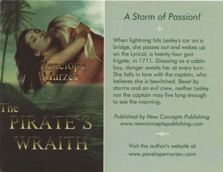 The Pirate’s Wraith, by Penelope Marzec, is a time-travel historical romance taking place in the 18th century—on a pirate ship, of course. Here’s another clinch cover, backed up by a palm tree and an ocean, but very much submerged by too much green. Because this is an ebook, how it looks in a thumbnail size is important, and alas, at that small size, the cover gets very dark and the title is unreadable. This cover attracted me because it was so green, but I can barely discern its details. However, a little touch-up to the saturation of the green, and changing the fonts to make the title and the author’s name contrast strongly with the background, and this cover will make the statement it intends.